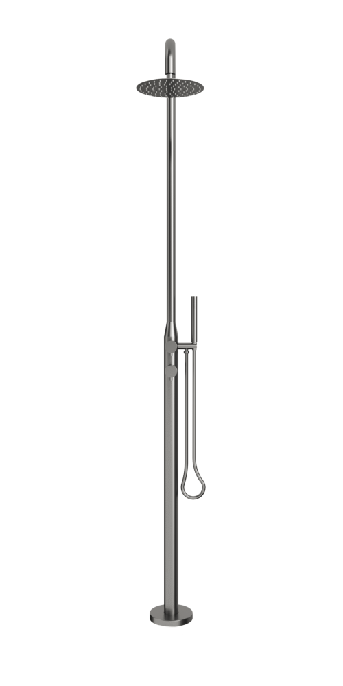 The brushed gunmetal finish offers a modern architectural look while enhancing corrosion resistance and long-term surface integrity. Featuring a rainfall shower head and a hand-held shower wand, the LA Gunmetal provides flexibility for rinsing off after swimming, beach use, or outdoor activities.